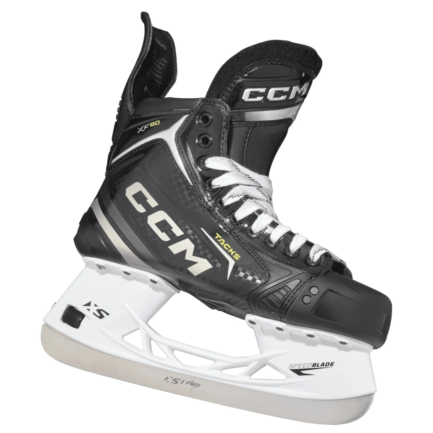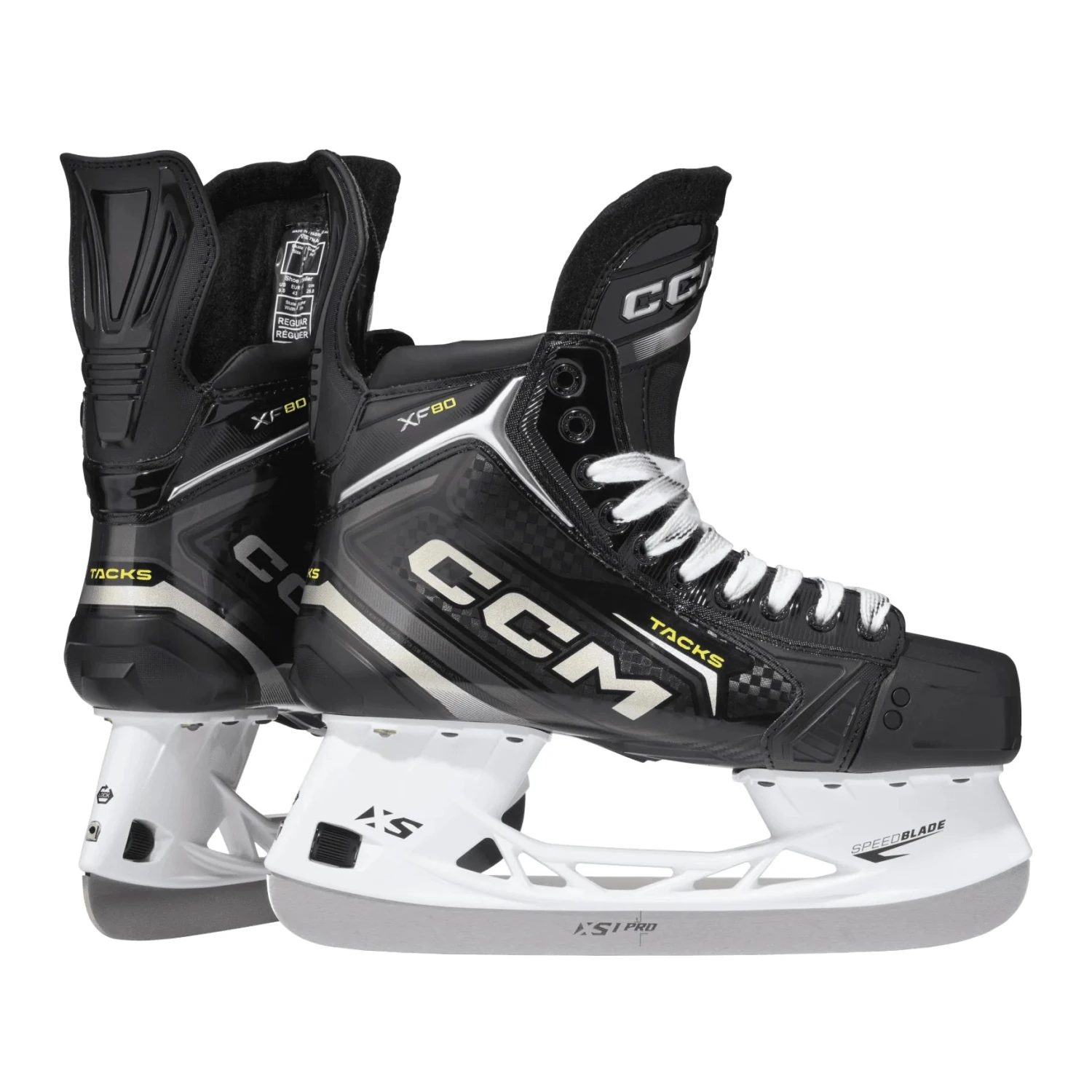 Experience superior performance with the CCM Tacks XF80 Ice Hockey Skates. The one-piece boot provides maximum energy transfer and a snug fit for strong and quick strides. The thermo-formable core and HD microfiber liner offer durability and deep comfort. The improved flex tendon and memory foam ankle padding enhance speed and support.