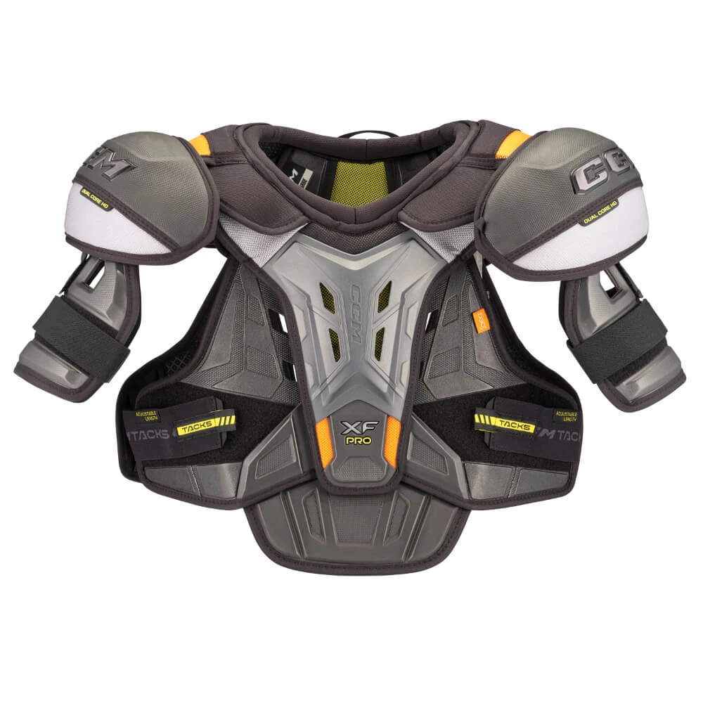 Maximize protection and mobility with CCM Tacks XF Pro Shoulder Pads. Featuring ASD and Amplified Mobility Design with ZOTEFOAM side panels for elite players, as well as dual core HD foam caps with D30 Zero construction for enhanced impact absorption. ADPTFIT straps and air channels provide elite ventilation.